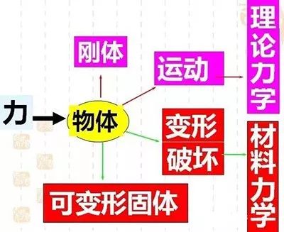 理論力學,研究剛體,研究力與運動的關系;材料力學,研究變形體,研究力與變形的關系。