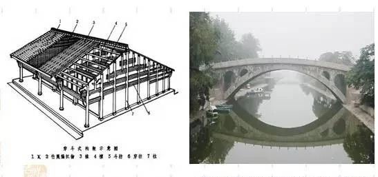 左:傳統具有柱、梁的木質房屋結構;右:趙州橋。