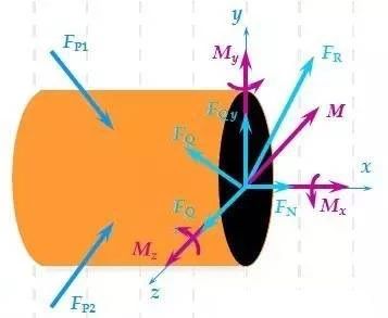 根據材料的連續性假定,作用在截面上的內力應是一個連續分布的力系。在截面上內力分布規律未知的情形下,不能確定截面上各點的內力。但應用力系簡化的基本方法,這一連續分布的內力系可以向截面形心簡化為一主矢FR 和主矩M,再將其沿三個特定的坐標軸分解,便得到該截面上的6個內力分量。