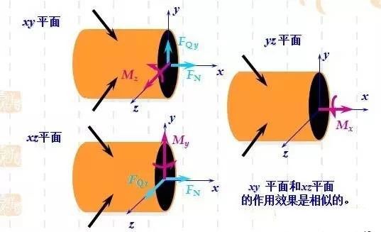 在一定條件下,桿件所有內力分量作用的效果,可以視為各個內力分量單獨作用效果的疊加。通常可歸結為三組平面內內力分量與外力: