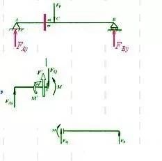 此時,左段上作用有外力FAy,為保持平衡,截面m-m 上一定作用有與之平衡的內力,將左段上的所有外力向截面m-m 的形心平移,得到垂直于梁軸線的外力Fˊ及作用在梁對稱面內的外力偶矩Mˊ,根據平衡要求,截面m-m 上必然有剪力FQ和彎矩M 存在,二者分別與Fˊ與Mˊ大小相等、方向相反。