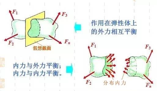 當用假想截面將桿件截開,考察其中任意一部分平衡時,實際上已經將這一部分當作剛體,所以所用的平衡方法與在工程靜力學中的剛體平衡方法完全相同。