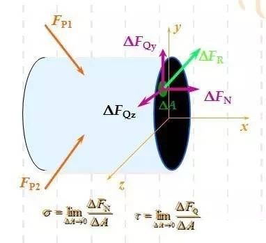 分布內力在一點的集度,稱為應力 (stresses)。作用線垂直于截面的應力稱為正應力 (normalstress),作用線位于截面內的應力稱為切應力或剪應力(shrearingstress)。應力的單位記號為Pa或MPa,工程上多用MPa。