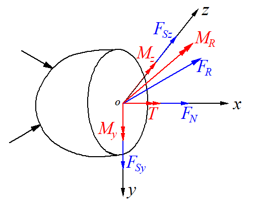 以截面形心為原點,建立直角坐標系如圖x軸垂直于橫截面,即沿桿的軸線方向,y、z軸在截面面內。把主矢向三個坐標軸分解可得三個分量:沿著x軸的軸力,沿著y軸和z軸的剪力。