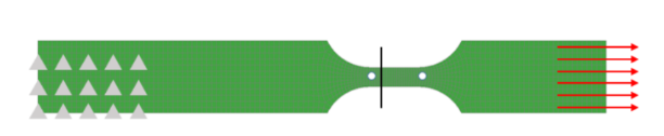 為驗證試驗數據和擬合獲取的真實應力-塑性應變曲線的有效性,通過LS-DYNA軟件對試驗材料進行了有限元模擬仿真分析。考慮到材料模型對網格尺寸的敏感性,采用實體單元對試樣進行網格劃分,有限元模擬試件尺寸與實際試件相同(參見下圖)。參照試驗條件,試件左端固支,右端采用*BOUNDARY_PRESCRIBED_MOTION對試件加載(輸入速度-時間曲線)。通過在測量段設置橫截面*DATABASE_CROSS_SECTION_PLANE定義拉伸載荷輸出(下圖中黑實線),同時在測量段兩端選取兩個節點(下圖測量段兩端的白色圓點),定義*DATABASE_HISTORY_NODE,通過計算這兩個點的相對位移獲得拉伸位移量,并將仿真獲得的載荷對位移曲線和試驗進行比對完成對標。