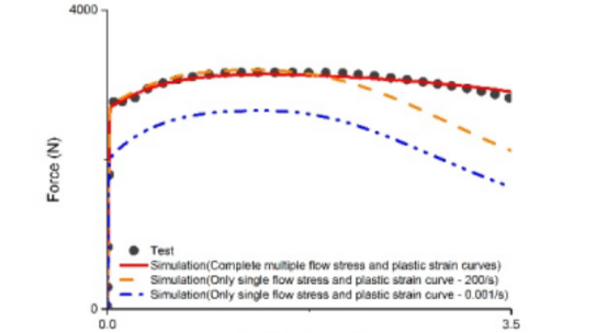 注:模型采用LS-DYNA 24號材料卡*MAT_PIECEWISE_LINEAR_PLASTICITY描述鋼材料力學特性,使用*DEFINE_TABLE和*DEFINE_CURVE關鍵字輸入一組應變率效應流動應力-塑性應變曲線。