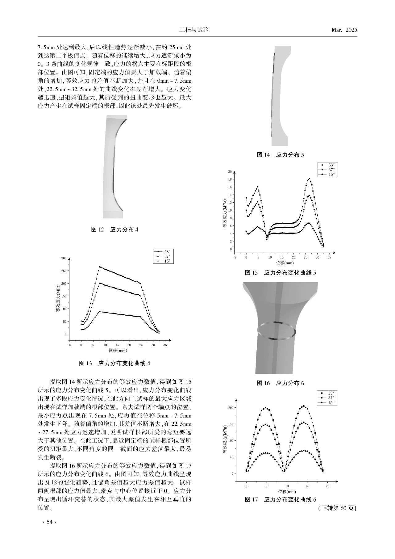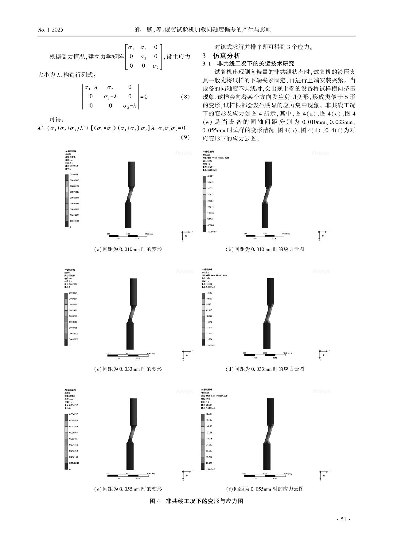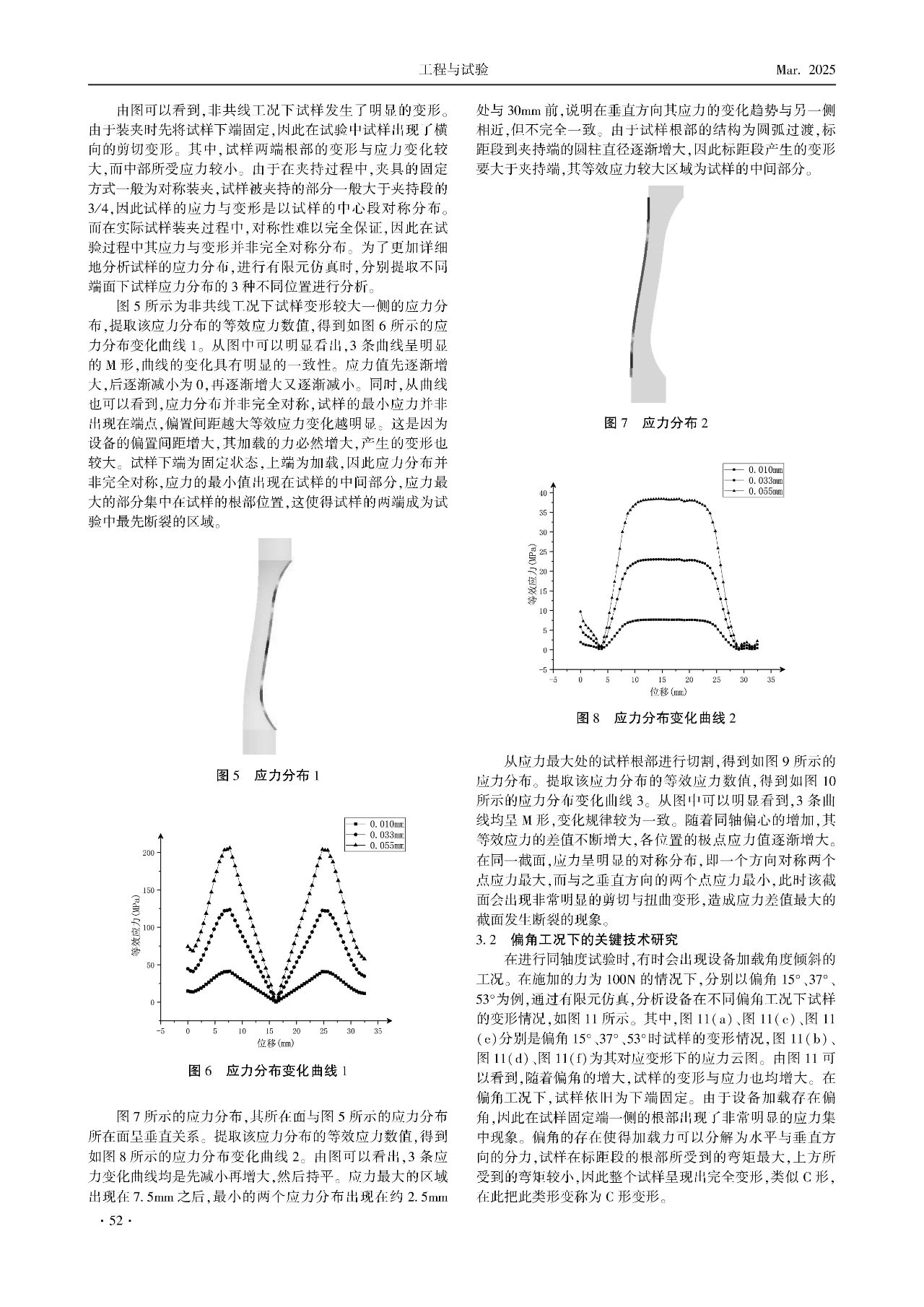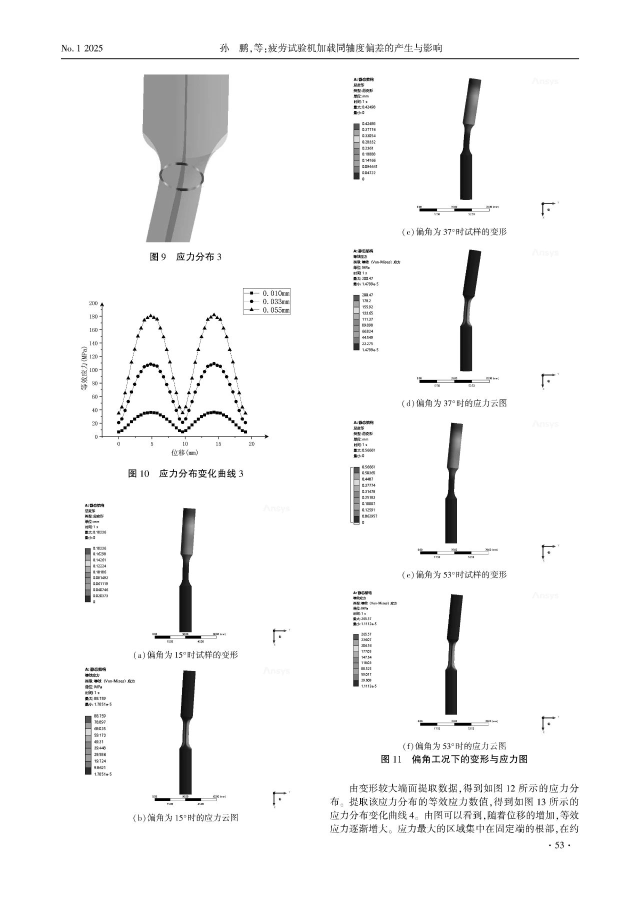 同軸度對疲勞試驗機的影響極為顯著。本文基于有限元仿真理論,分析在非共線與偏角工況下試樣變形與應力變化規(guī)律。研究發(fā)現,在非共線工況下,試樣出現橫向擠壓現象,試樣會向著某個方向發(fā)生剪切變形,形成類似于S形的變形,試樣表面變形較大一面的應力分布呈現明顯的M形,與該應力分布呈面垂直的應力分布呈現扁平的M狀態(tài),應力劇烈變化段與最大差值部分集中在試樣的根部位置,且隨著偏置間距的增加,應力差值與曲線斜率逐漸增大。在偏角工況下,偏角的存在使得加載力可分解為水平與垂直方向的分力,試樣呈現出C形的變形,沿試樣表面變形較大一面的應力出現兩個拐點,隨著角度增大而差值增大,與該應力分布呈面垂直的應力分布在試樣標距兩端的根部出現拐點,且靠近固定端根部的位置應力差值最大,最容易發(fā)生斷裂。在這兩種工況下,截面應力均呈現循環(huán)分布的狀態(tài)。